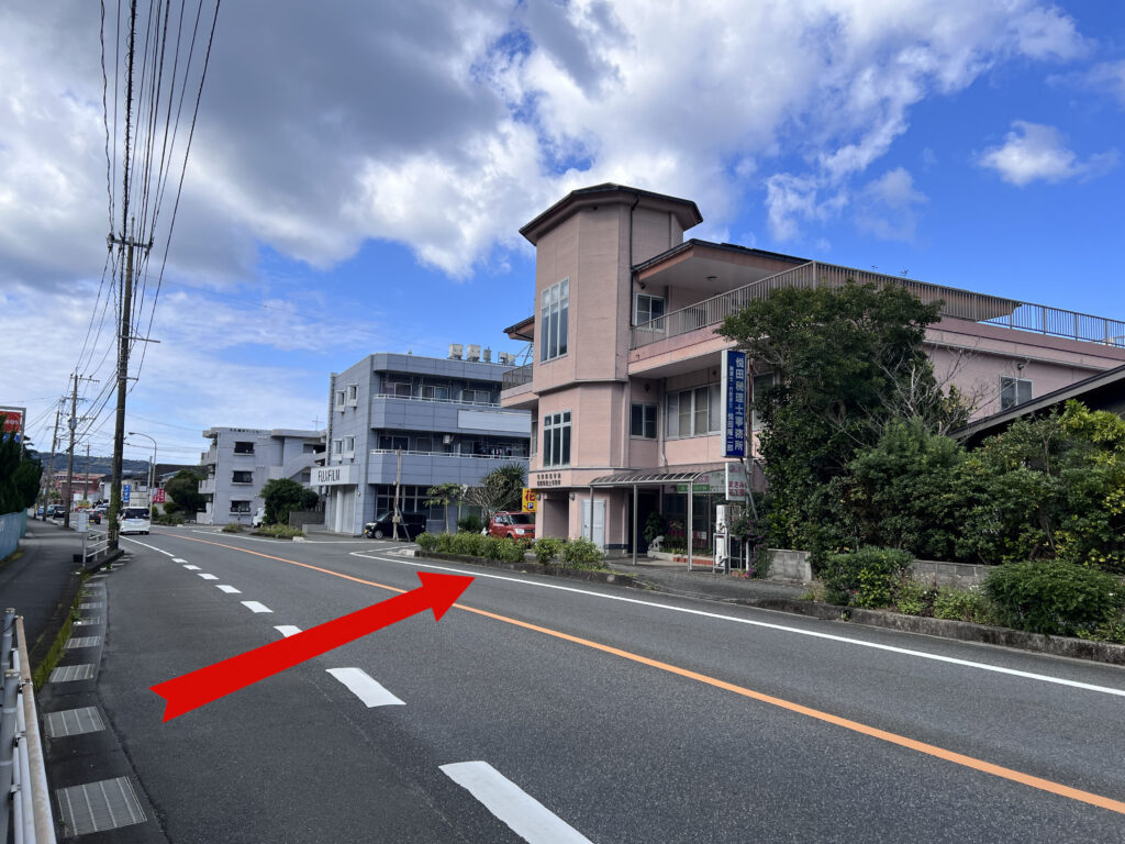 県道82号線を龍郷方面へ向かって見た建物1階が店舗です。